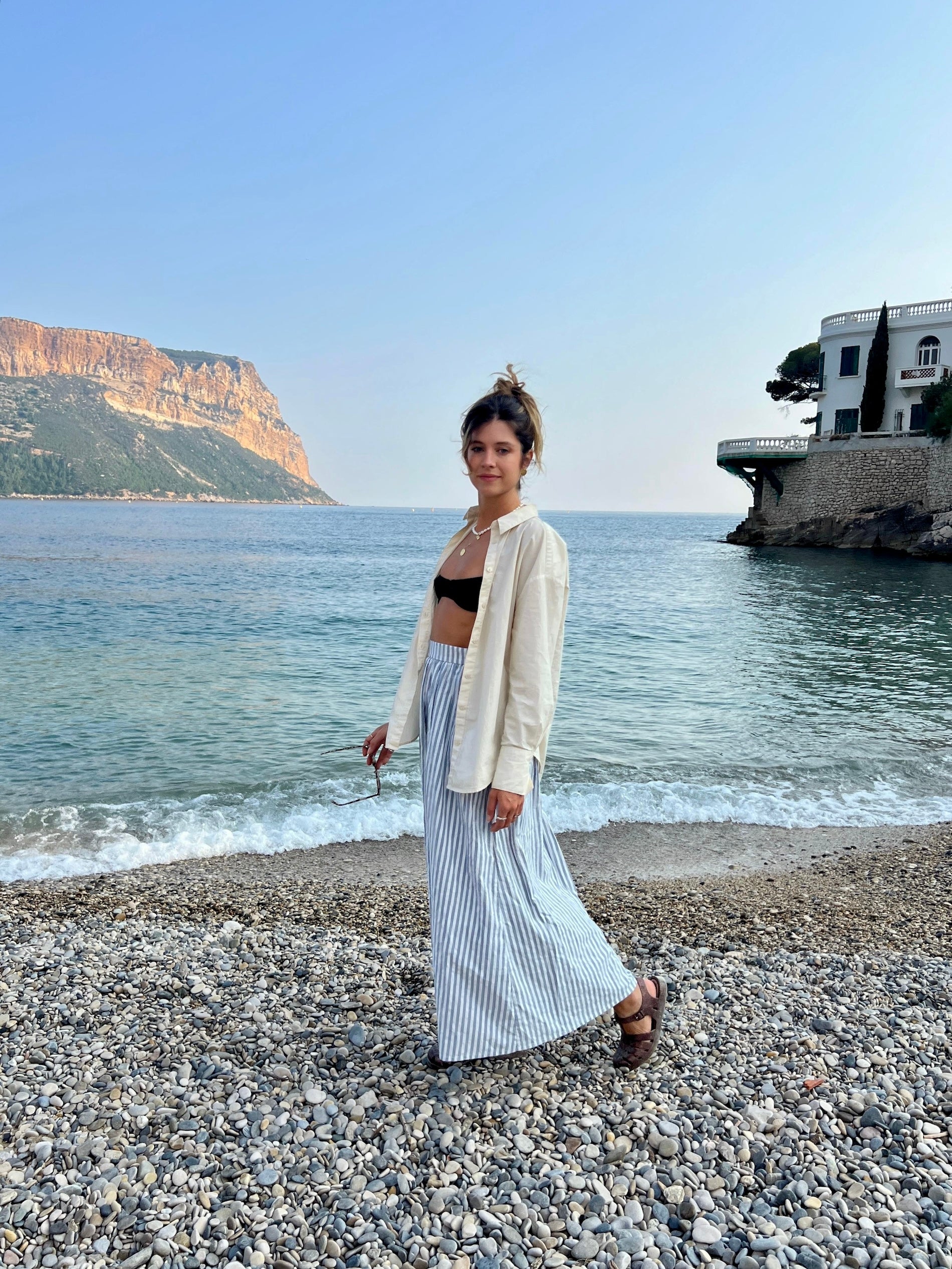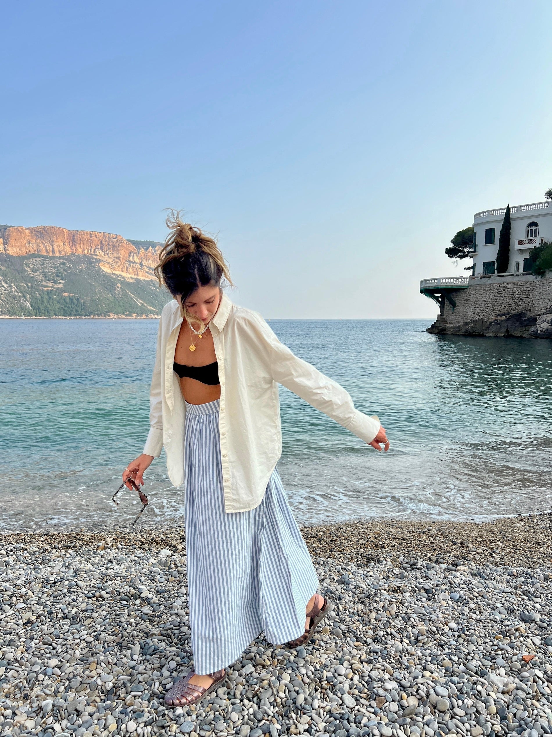 A saia Madrid é uma saia com modelagem ampla e formato A, possui bolsos laterais, zíper invisível no centro das costas para seu fechamento e comprimento midi. Confeccionada em tecido de algodão e poliéster reciclado, na cor listras azul e off-white.