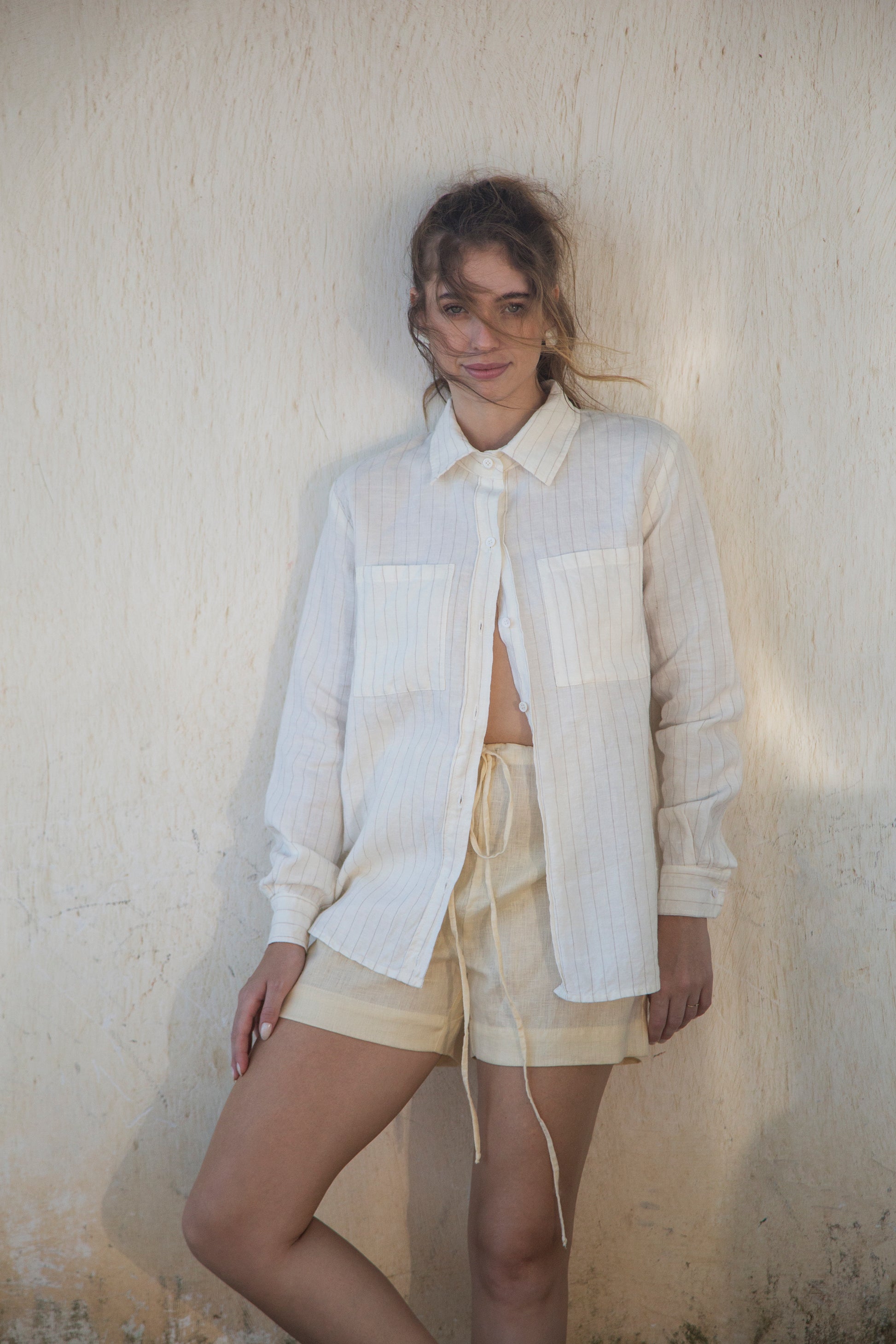 O short soltinho com cintura alta e regulagem por cordão de algodão, moldando-se ao corpo como você preferir.